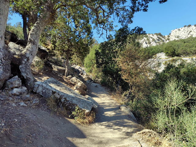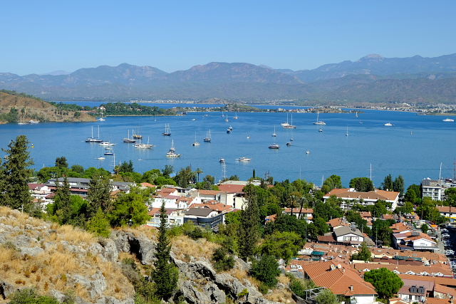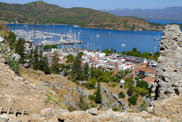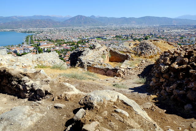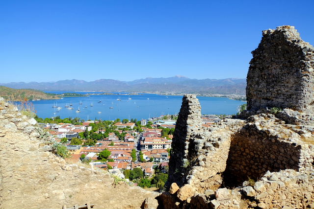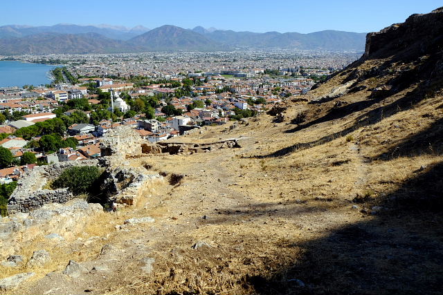 この高さから見下ろすフェティエの景色は見事。道は岩ゴロで危なっかしい。山用の靴じゃないし足腰も弱ってるんでこんなことは避けたかったんだが高い所があると登りたくなる。こんな誰も来ない所で落っこちたら、と思うと足に力が入りすぎる。上は岩を積んだ要塞跡で景色がなかったら殺風景な所だ。真っ青な空と青い地中海、大小のヨットが転々と浮かんでいる。反対側(街側)に道が降りていたのでそっちを辿ってみたが行き止まり。また登ったりしていると汗でベトベトしてきた。ここは乾燥してるからこの程度で済むんだろうけどタイだったら汗ビショになってるだろう。