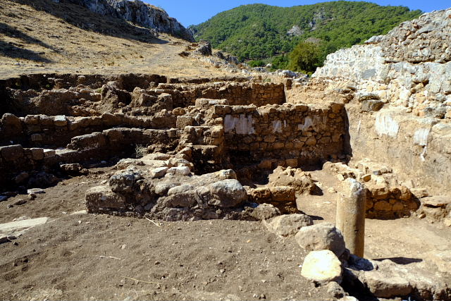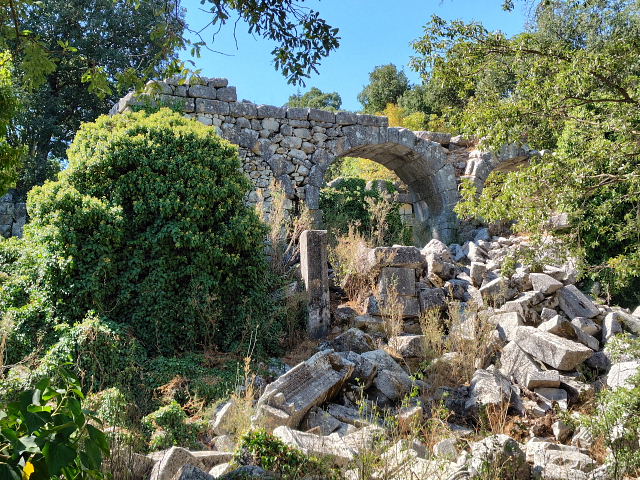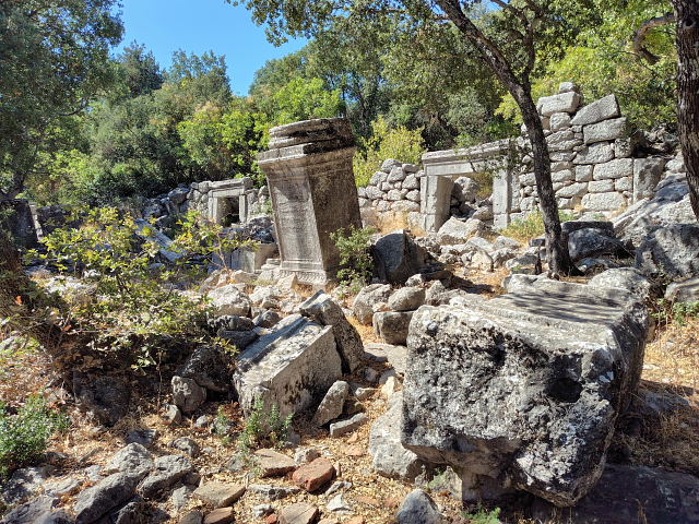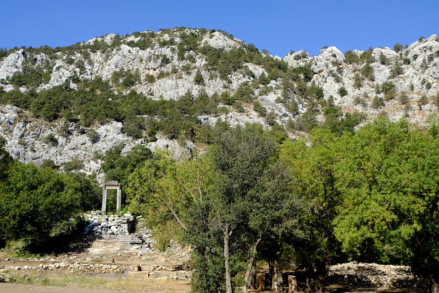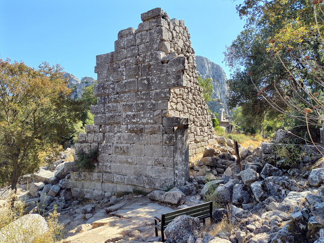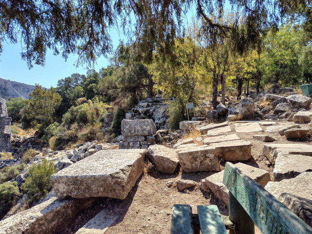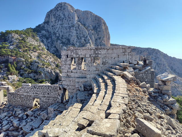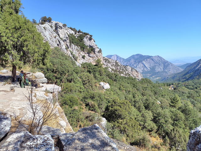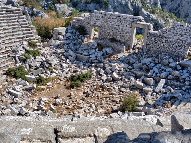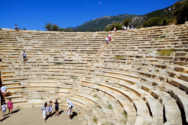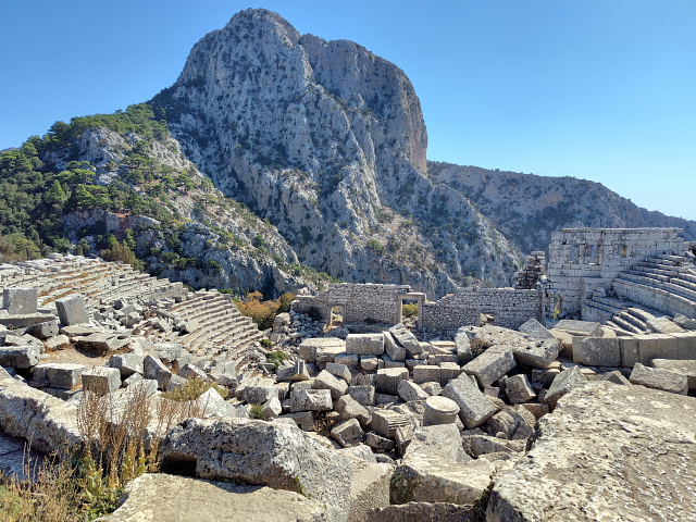 岩ゴロ道を20分ほど登ると遺跡の縁に着いた。いろんな表示板が立っているがこちらの目的地はただ一つ、シアターのみ。登って行くと岩山を背に何年も想っていた古代劇場が見えてきた。若者グループが一組来ていただけで帰ってしまうと静寂、天空の劇場が目の前にある。トルコのマチュピチュと言われるだけのことはある。自分が予想していたイメージとピッタリ一致している遺跡。妻の遺灰(残り半分)を劇場上段に蒔いた。この前は地中海が見える小劇場、今度は神々が観覧する天空劇場。妻が死ぬ前に“もっとやりたかったことは”と聞くと“ピアノを牽いていたい”と言っていた。体力がなくピアノを牽くことは断念したが、こんな所で“幻想即興曲”を弾けたら本望だろう。
