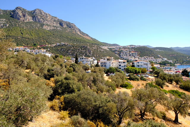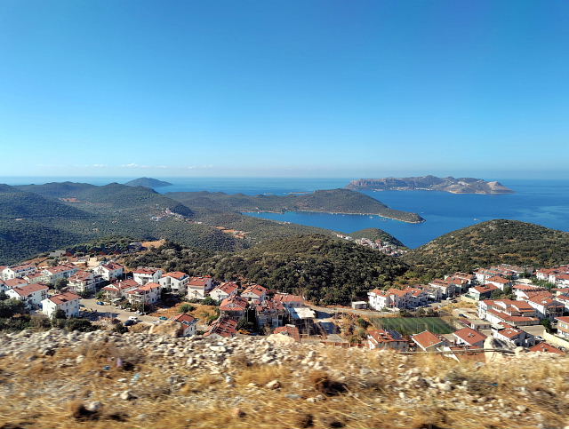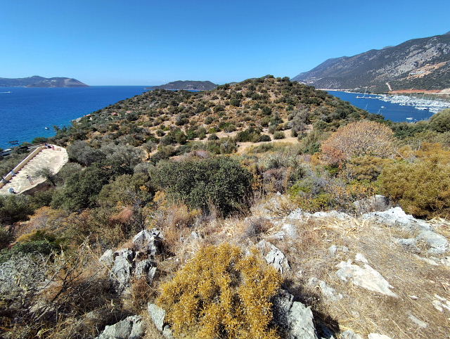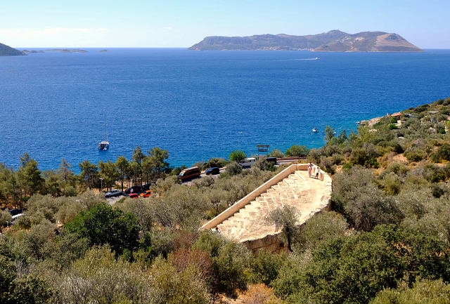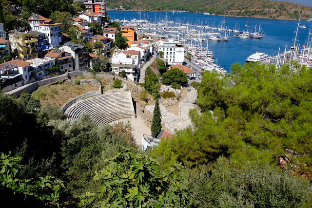 カシュの街も山にへばり付いたような所なので傾斜がキツい。さてここのお目当ては町外れにある Antiphellos Antik Kenti(古代劇場)。オトガルから一下りしてから遺跡まで登り直す。この劇場はさほど大きくないけど綺麗に補修され上段まで登ると地中海を見下ろして素晴らしい雰囲気を持つ。トルコの遺跡(劇場)でも間近に地中海に面しているのは数少ない。ここはイイなあ、でも街から近いので観光客も割合多い。さらに上に上る小道が付いていたので登ってみると劇場、地中海と反対側のヨット・ハーバーが見える所に着いた。妻がピアノ演奏していた小ホール並みの劇場が真下に見えている。ここに遺灰を蒔こう。出不精の妻だったが景色の良い異国の丘で眠るのもいいだろう(自分の勝手な想いなんだが)。自分もまたここに来ることはないと思っている。