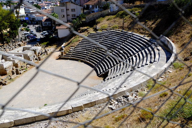 着替えて散歩。この街で一番見たかった古代劇場、途中のモスクにも寄らずに直行したが……あれ閉鎖されている。フェンスの外から見た感じでは小さなシアターであんまりインパクトがない。トルコの古代劇場を見物することが今回の旅の本命だったが、現物を見るとそんな気分も醒めてくる。まだ1ヶ所、それも閉鎖している所だから何とも言えないけど。