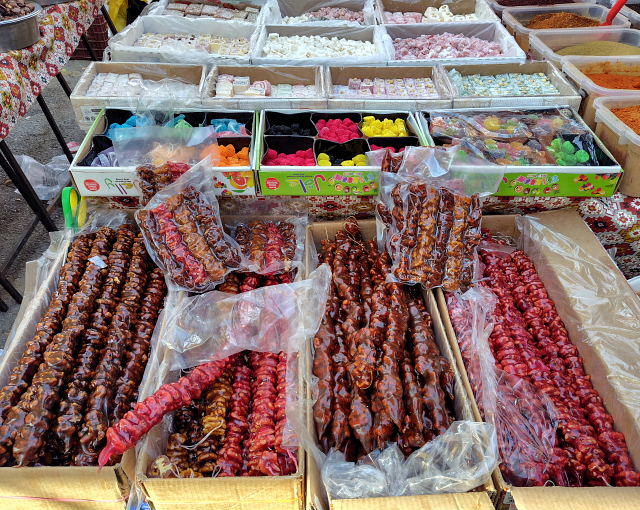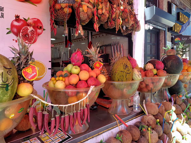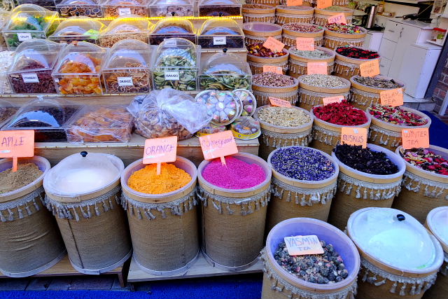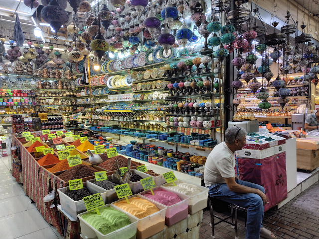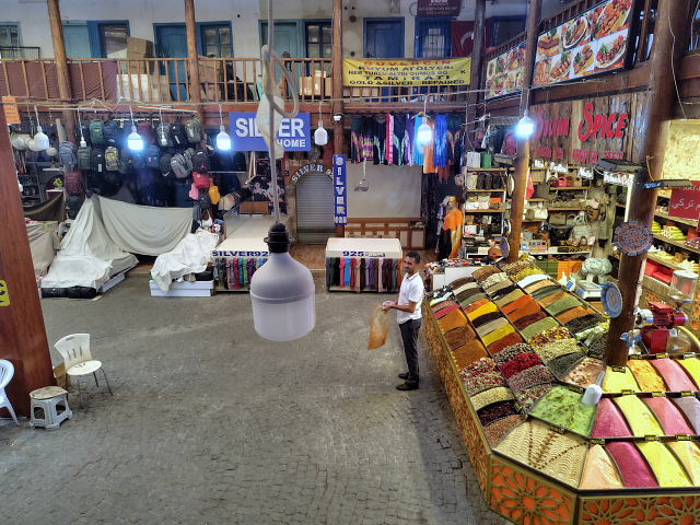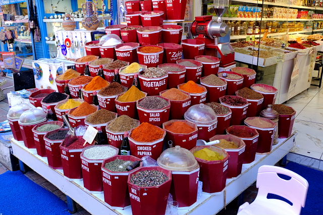 喉が渇いてきたのでヨットハーバー角のカフェ(名前不明)でレモネード、場所代もあり200TLもした。マア一番高くつきそうな場所だが。本通を一本南に入るとスパイス、干し果物の店が並んでいた。魚市場もありそこで食べることも出来るようだったが……昼は食べる気がせんなあ。