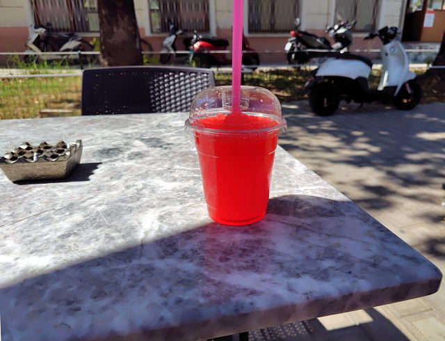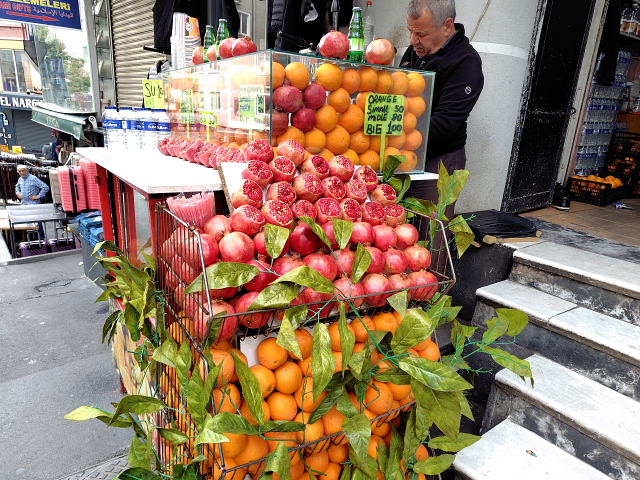 ホテルに帰り部屋に入るとまだ掃除してない。レセプションにニイチャンに言うと“3時までには……”、本当に4星ホテルなんか。仕方なしに時間潰しのもう一度外へ。疲れている時の石の道はシンドイ。どっかでドリンク、でも座る所は高いし。道沿いのフルーツジュース・スタンドでレモン・スムージー(70TL)。中国人かと聞かれた。日本人は少ないんだ。