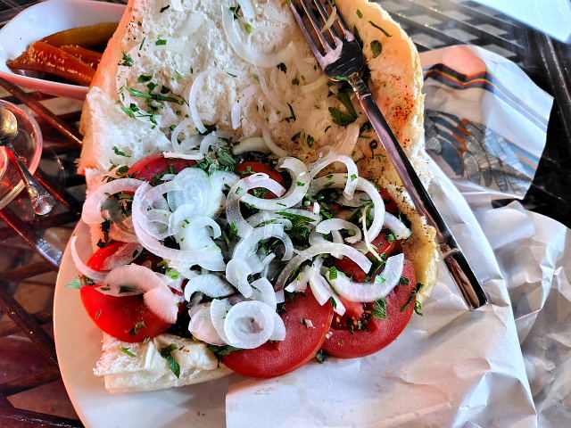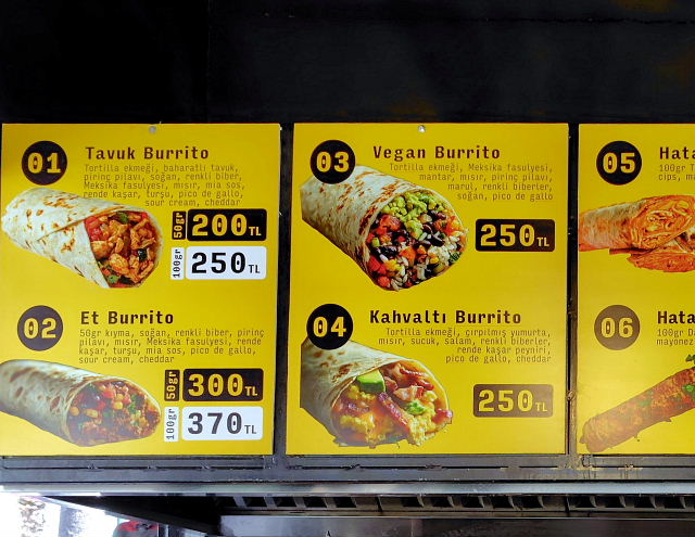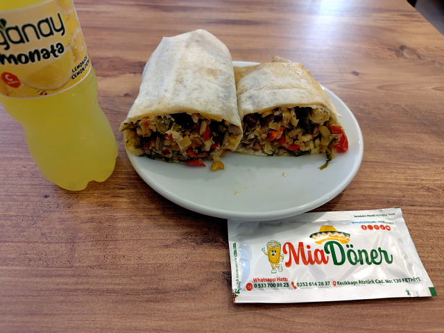 少しハイキングしただけなのに疲れてきている。今夜はどこで食べようか。また出ていくことを考えるとシンドクなってきた。バーガーの店 MiaBurrito店頭看板に“ヴィーガン・ブリトー(ラップみたいな)”みたいなのが出ていた。よし今夜はこれにしよう。250TLと高目だけど体には良さげ。人気の店のようだった。もう1軒のスーパーで明日朝食用のサンドイッチとパン、レモネードを買った。