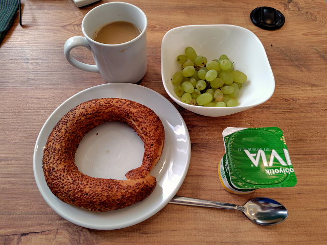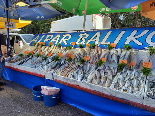 昨日閉まっていた円形劇場だがネットで見ると日曜日はクローズと書いてある。そんな感じじゃなくズッと閉まってるように見えたんだがマア明日もう一遍行って見よう。夕食は運河沿いに並ぶ屋台でバルクエキメッキの店 Fethiyem Balık Ekmek(グーグルマップでは)。昨日歩いた時から気になっていた店。サバサンドとレモネードを注文、265TL。出てきたのは分厚いパンの真ん中に大きなサバが野菜と一緒に挟まれていた。ボリュームがある。イスタンブールで食べたのは洗練されていたがここのはハード。味もイイ、サバ1匹とサラダ、パンを食べてるんだ。帰りに葡萄(房)を買う、大きめのを一房で60TL。トルコでは葡萄が安い。その国に合う(採れる)物を食べたり飲んだりしたら良い。