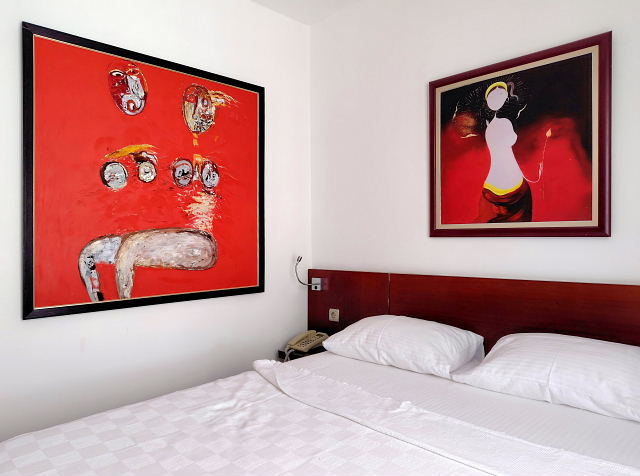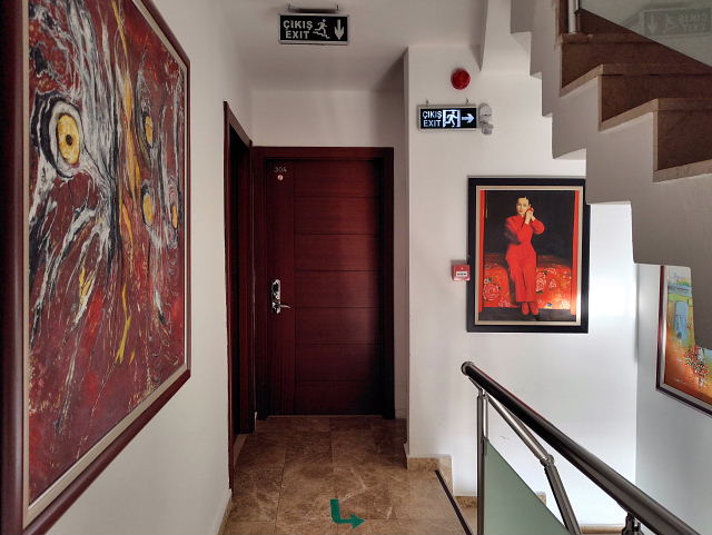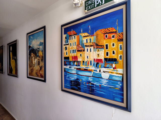 ガーデニア・ホテル、1時半チェックイン。フロントのニイチャンにフリーWiFiのパスワードを聞いた。朝食は8時から2階のテラスで。トルコの宿はどことも朝食が遅い。せめて7時台にしてくれたら行動が楽なんだがトルコに来る人はノンビリ過ごしてるんだ。この宿はリフトがないので4階まで歩いて登る、年寄りにはキツい。始めに泊まったイスタンブールの宿並みに狭いけどバルコニー付なので洗濯物は干せるし海も一部見えている。コンセントはやはりCタイプ。インスタントコーヒー付、ティッシュはない。小さな部屋だけど飾ってある絵が気に入った。部屋だけじゃなく通路、階段にもイイ感じの絵が掛けられていた。同じ人が描いたようでベトナム、カンボジアの風景が多いようだった。