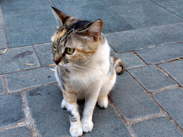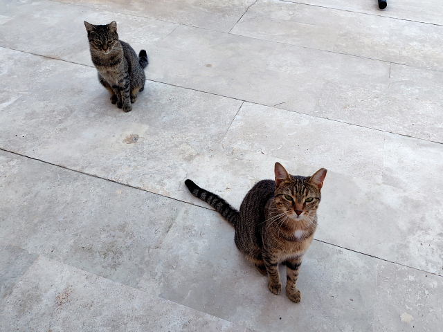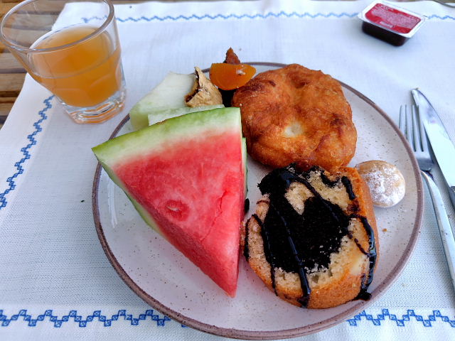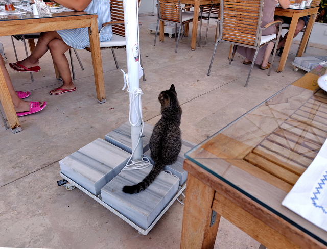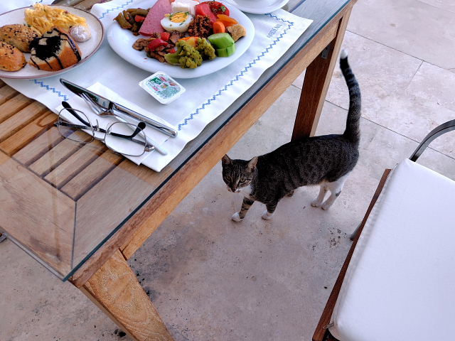 今朝の朝食も昨日とほぼ同じ。今日はお客が何組か来ていた。同じ宿に泊まってる人かな。波もなく穏やかな地中海、朝から釣りを楽しむ人もちらほら。猫チャンも一緒に。写真にしたら抜群の所で美味しい物を食べているように見えるだろう。ユックリ出てくるので食べ終わるのは1時間ほど掛かる。