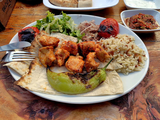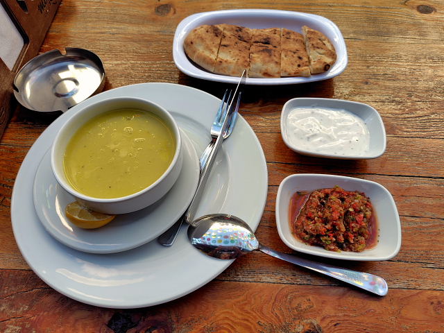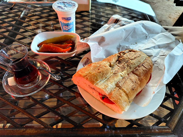 宿までは1kmちょいだから大した距離じゃない。なのに足がフラついている。この程度の重さのザックでこれじゃ他人を批評する資格がないなあ。宿までの途中にあったロカンタSahil Lokantaları 1で昼食、390TL。ベジ物ばかり選んでしまった。不味くはないんだがどれもイマイチ好みとは言えない。タイ料理みたいに是非次も食べたいというのがない。サバサンドは美味かったけど。