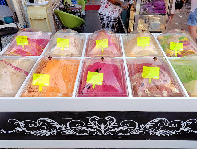 カレイチは曲がりくねった細道が迷路のように入り組んで方向感覚が狂う。そんな所に宿、レストラン、グッヅ店が軒を連ねていた。海辺に降りると遊覧船がいっぱい停まっている。この辺りは砂浜がなく岸壁が続いている。公園に上ると遠くに白い砂浜が見えていた。真下の入り江にもビーチパラソルが並び泳いでいる人が大勢。カレイチは城壁に囲まれた街。当初はこの中に建つホテルにしていたけど気が変わり今のホテルに代えた。こんな歴史的地区内の建物はどこも狭苦しそう。見て回るのには良いだろうけど住むとなるとどうかな。海辺の屋台は何処もメチャ高い。公園でドンドルマ(75TL)を食べた。