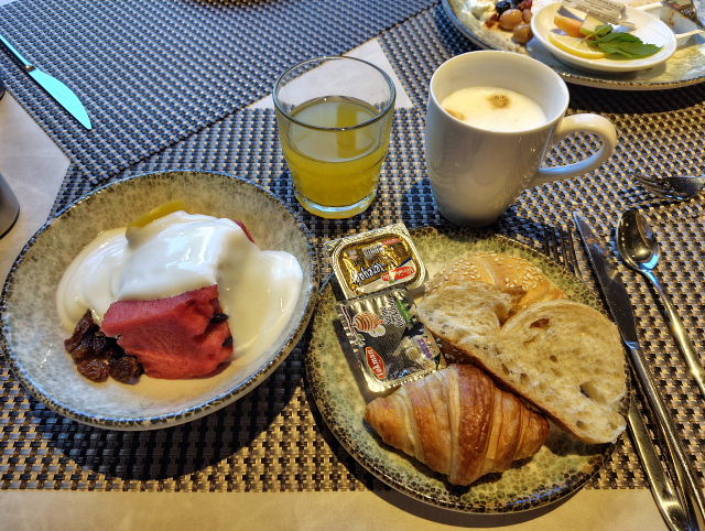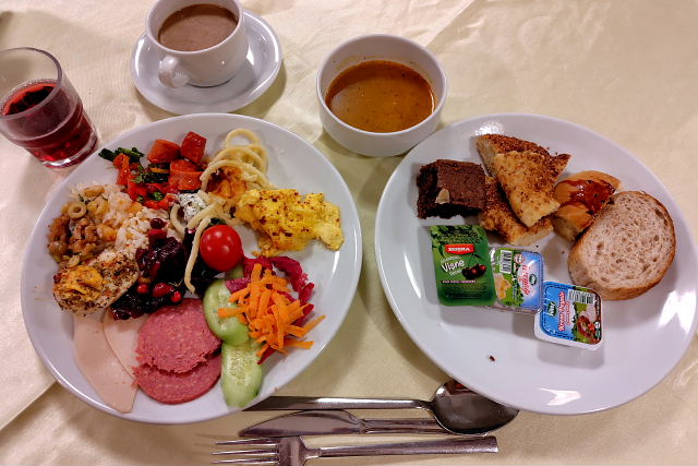 今日は長丁場なので朝の飲み物は控えめにした。8時朝食だから暇を持て余す。リフトがないから宿内の登り下りもシンドイ。海が見えるテラス席に座り、前菜色々、メイン料理(どれがそうなのか分からん)、パンだけはどの多度も豊富、ジュース2種類。食べてるとお客が続々やってきた。ロシア語みたいなニュアンスでサッパリ分からん。英語、フランス語、ドイツ語じゃない事だけは確か。40分ほどで終了。