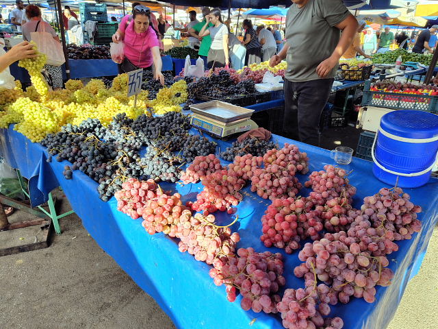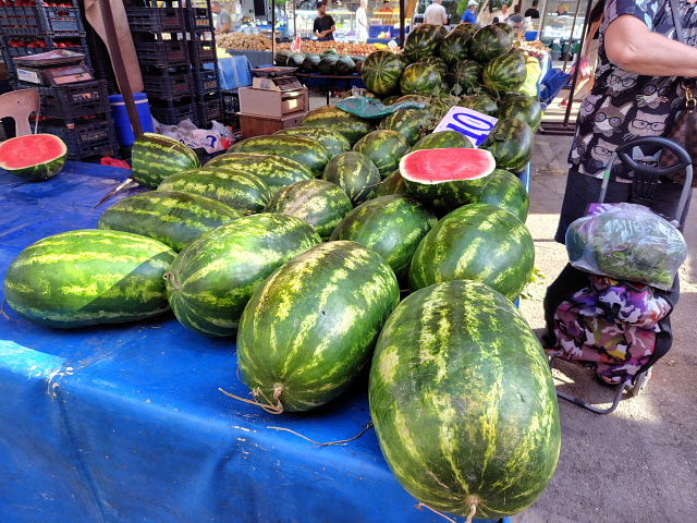 ホテルに帰り一服、今日は部屋掃除が終わっていた。今日の夕食はカレイチ入口の魚料理の店にしようと決めていた。その前にフライデーマーケットなる市が開かれていたので寄ってみた。出し物は生鮮野菜、果物がメインで観光客向けじゃなかった。果物も葡萄、スイカ、りんご、ミカンが主でカラフルな熱帯果実の類いはなかった。
