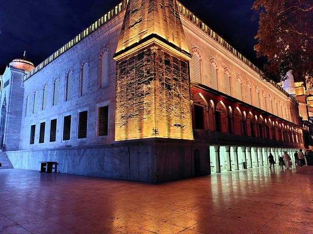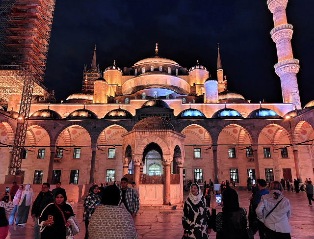 夜のモスク見学もいいか、昼より空いているかもしれないと Sultanahmet Camii(ブルーモスク)に行ってみた。周囲はレストランばかりでどこから入るのか分かりにくい。南側の通りから北に回ると入口があった。さすがイスタンブール一のモスクだけあって夜8時でも観光客で混んでいた。夜景が美しいモスク内は小宇宙の趣き。スマホでパシャパシャ写すが、カメラじゃないと写真を撮ってる気がしない。