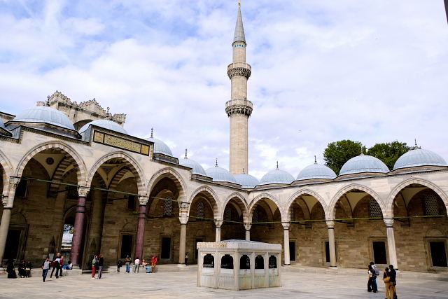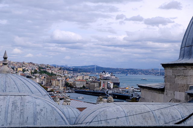 モスク巡りの最後はバカでかい Süleymaniye Camii(スレイマニ・モスク)。もうどれがどれか分からん。1日3ヶ所が限界だ。ここは観光名所になっていて団体さんも大勢きていた。中は騒然として落ちつく場所じゃない。内庭に出ると海が見えてくる。海を隔てた向こうの丘にナンかの塔と大きなモスクが見えている、何処だろう(後で調べたらアジア側のモスクだった)。