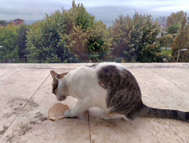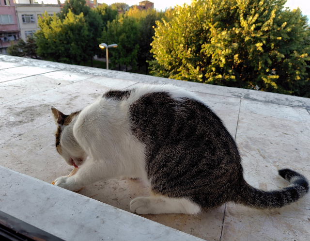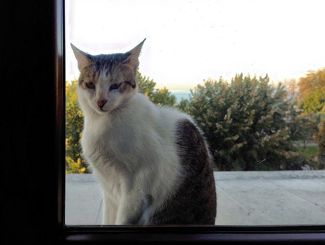食後上の階に上がりテラスに出てみた。朝のマルマラ海とモスクの尖塔、イスタンブールなんだ。猫が1匹寄ってきてスリスリ。この猫チャンは3日間何時も窓の外を歩いていた。この宿専属スタッフなんか。桜猫じゃなかったけど首輪もしてなかった。