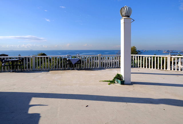 出発前に屋上に上がりマルマラ海の景色を楽しむ。昨日がこんな良い天気だったらボスポラス海峡を渡ったのに……マアまた来る楽しみが出来たとしておこう。スルタンアフメト発11時45分のに乗れば空港に着くのは1時前。でもその通りに行くかどうか、昨日見た感じでは20分ほど遅れるみたい。1本早いのでもイイかと10時20分チェックアウト。ここもすぐに“サンキュー”で終わり。この宿も良い感じだった。バス停までの道は2回通ってるからスンナリ行けた。もう10人ほど並んでいた。この程度なら余裕でOK。でもこの後からドンドン列が伸びてきた。11時前になると対岸まで並ぶようになっていた。バスは、中々やってこない、やはり今日もディレイか。