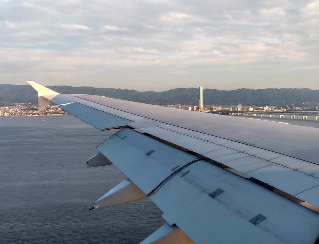 トイレに起きたついでに機内ラウンジでカプチーノを飲んだ。これだけ機内が広いと軽く体操も出来るし長距離便では非常に楽。関空到着2時間目に朝食。和食にしたが超美味!!!。さすがはエミレーツ航空。窓際席なので景色がよく見える。徐々に高度を下げ金剛山、関空連絡橋が見えてきた。たった2週間の旅だったけど新しい旅立ち(妻とは別の世界に)みたいだった。こんな旅をしていけるのも後何年かなあ、動ける内は選り好みせず出来るだけいろんな国に行くようにするべきなのかなあ。