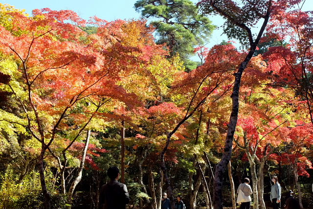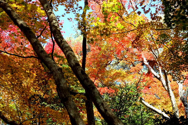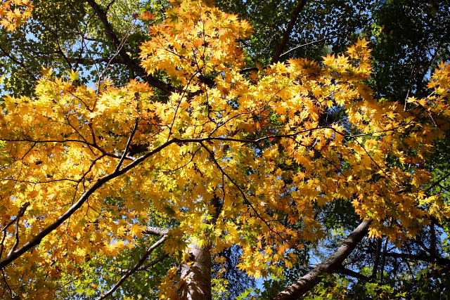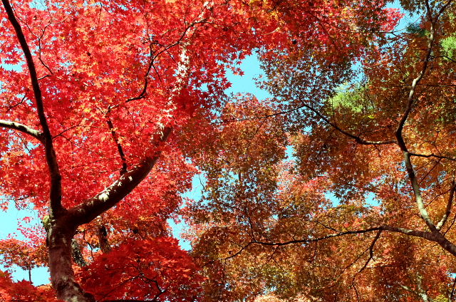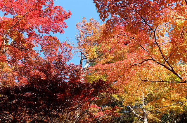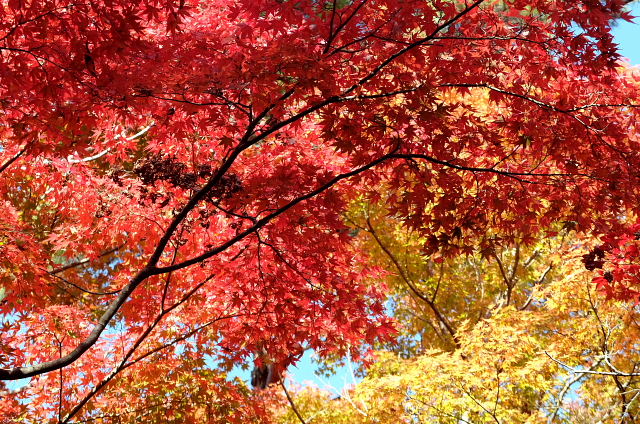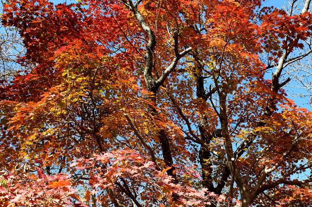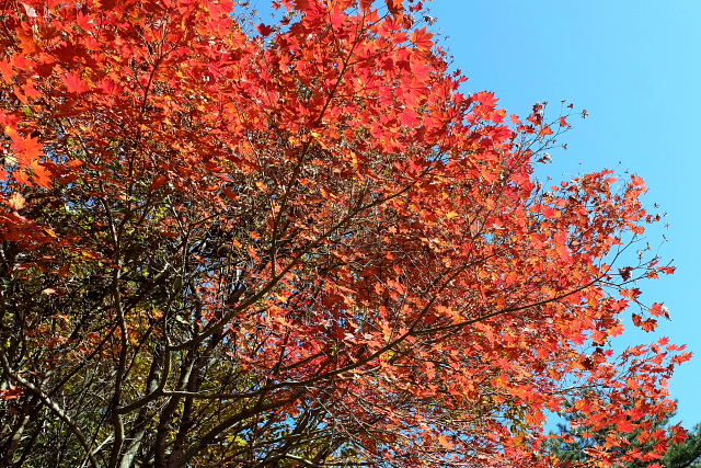 さあ今年の紅葉は如何に、公園に入るなり赤い紅葉が目に入る。おお中々イイ色合いじゃないか。まだ緑のモミジもあるけど赤いのが目立つ。この公園は黄葉より紅葉が素晴らしい。あと1週間経てば全山紅葉になるんだろうけど天気がどうなるか分からんのでナンとも言えん。今日はバックが青空だから充分綺麗だ。今年もこの景色を見られたんだ。また1年が過ぎていく。