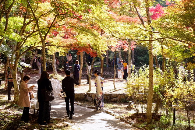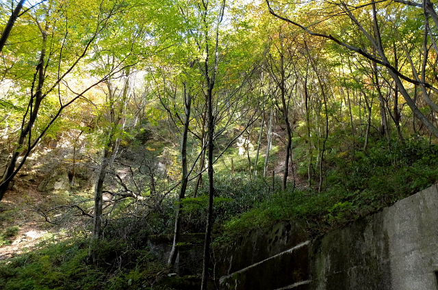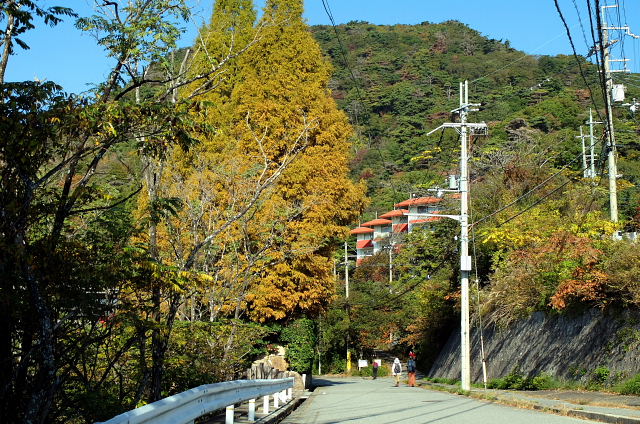 大きな堰堤下のゲート?を潜り緩やかな道に入ると紅葉が増してきた。この谷は上部よりも下の方が紅葉が進んでいる。公園から上の方も人工に植えたんだろうか。公園に近い沢まで降りると年配外人夫婦が来ていた。普通の格好でここまで上がってくるんだなあ日本人と違い外人は好奇心旺盛だ。