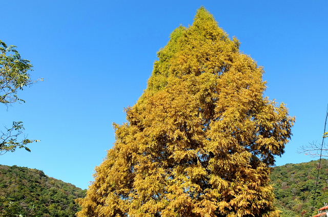 一軒茶屋辺りはよく紅葉していた。ここでこの色付きだと瑞宝寺公園も期待出来そうだ。瑞宝寺谷入口の道標もなくなっているが、それらしき所に入るとハッキリした道が付いている。始めはロープが張られた急な下りが続き気が抜けない。まだこの辺りは黄色が主体で綺麗というほどじゃない。何ヶ所も堰堤を越え沢を左右に渡り…時々間違って堰堤下まで行ってしまった。