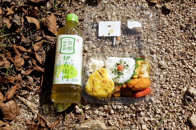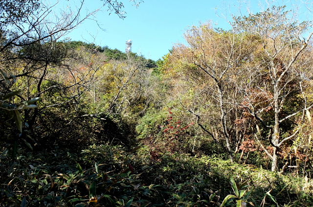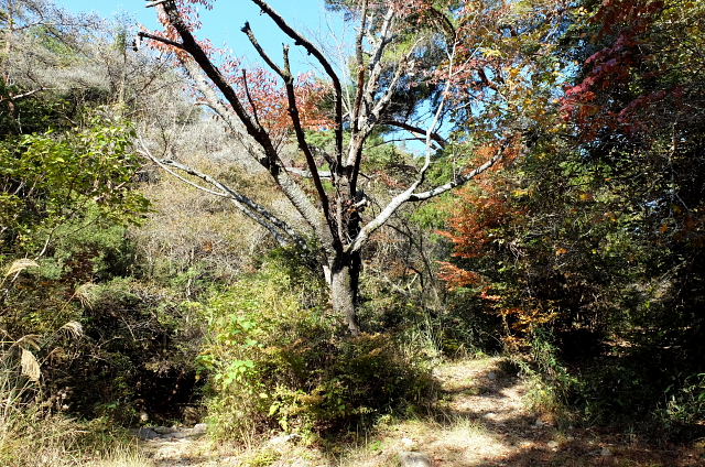 上に行くにつれ紅葉している木も出てきた。茶屋手前の空き地で少し早い昼食タイム。ここはルートから外れているのでハイカーはマズ来ない。コンビニのオニギリ弁当とお茶。気温は低くても陽差しがあり温かいから冷たい食べ物でもOK。次の山からはラーメンになるだろうなあ。