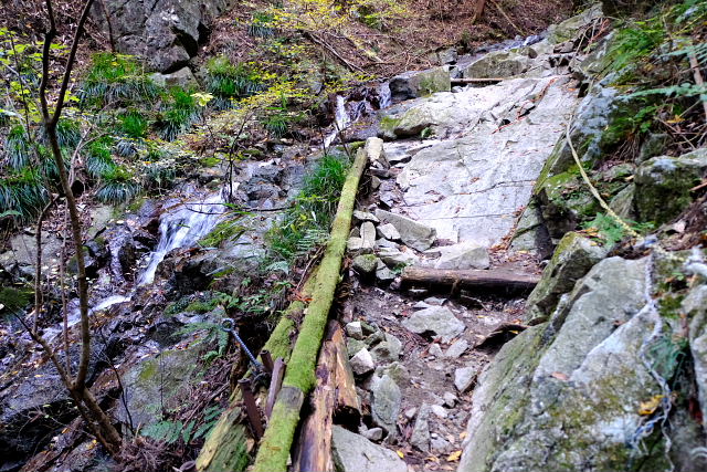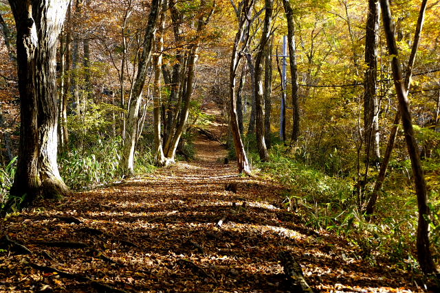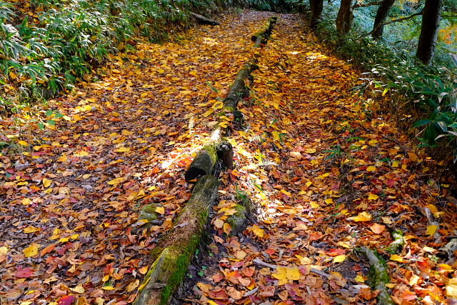 水越峠に下る道は大半が植林の中なので紅葉は期待出来ない。朝原寺道はそれ以上に広葉樹が少なく楽しみがないけどダイヤモンドトレールみたいな固い道じゃなく落ち葉が積もった道で靴が沈み込む感触は気分が良い。さんろくカフェのご主人がよく手入れされており要所に道標があるので迷うことはない。ただ落ち枝までの処理は手が回らないようだ。一般的な登山道じゃなく山慣れた人用の道と言える。