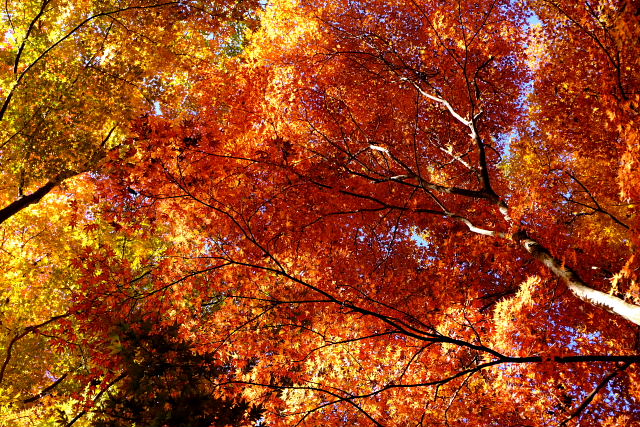 標高600mを越えているので上着を着ていてもヒンヤリしている。念仏坂を登り始める。夏場ならこの時間でも明るくすぐに汗がふきだしてくるが、11月中半になると細尾谷出合についてもまだ薄暗い。今日は細尾谷からカタクリ尾根を登る予定。谷筋よりも尾根の方が紅葉しているように思えるし明るいから写しやすいだろう。沢から尾根の平坦部までは急坂で息をつく。登り着いた長閑な尾根筋、カタクリ尾根の名前はどこから来たんだろう。この尾根筋にカタクリが咲くんだろうか。尾根の左側は植林で薄暗いが右側は明るく紅葉した雑木林。真っ赤という訳じゃないけど予想以上に色付いていた。