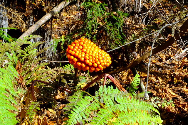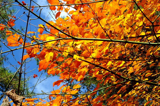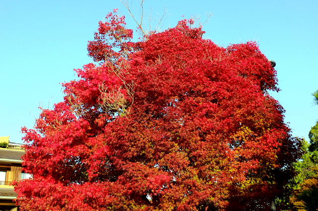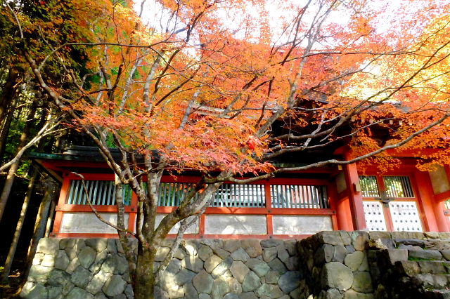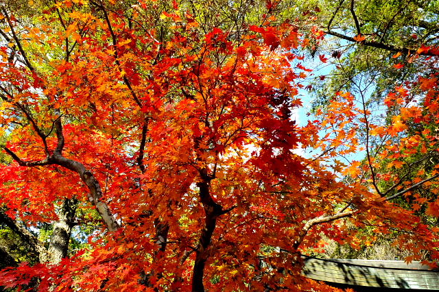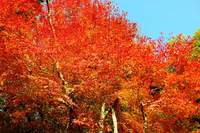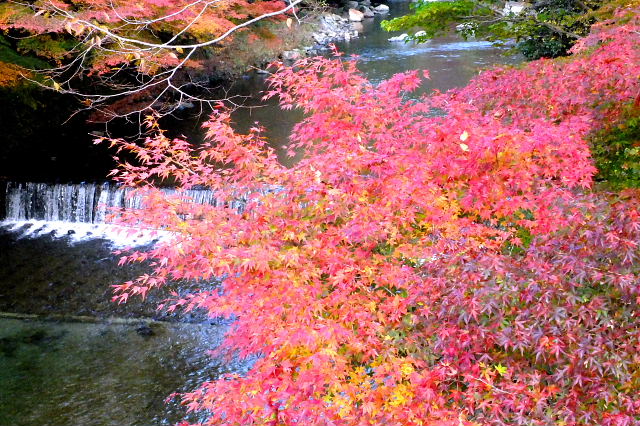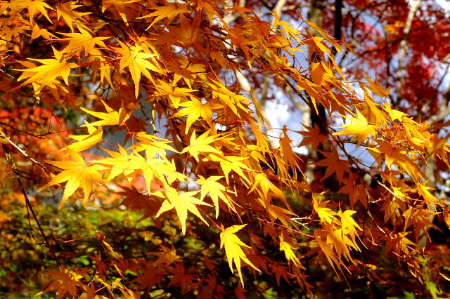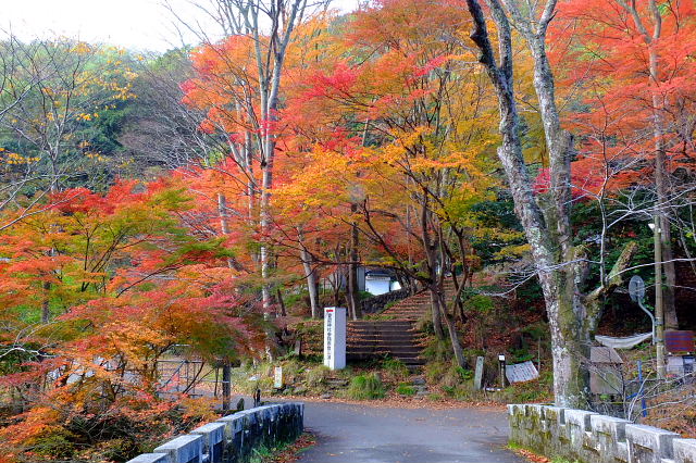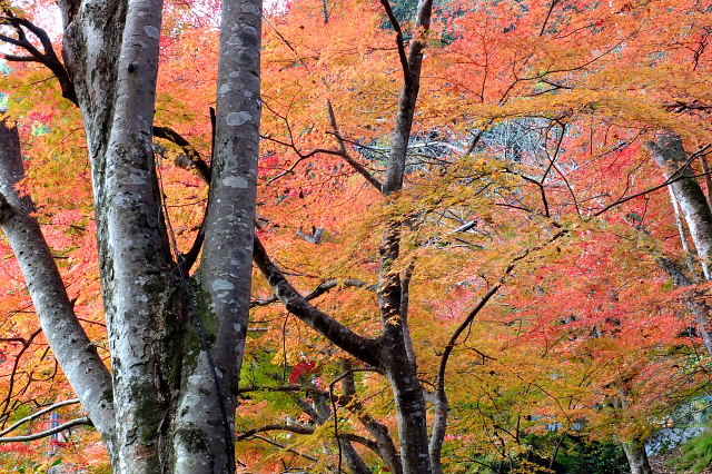 高雄に下る山道はシダが生い茂り倒木が多くなっていた。この道を歩く人も少ないんだろう。ここを歩くのは何時もツツジが咲く頃なので明るい所のイメージがあるけど花がないと薄暗い山道なんだ。神護寺多宝塔まで降り着くと紅葉した木々が出てきた。観光客もチラホラ。今が見頃なのかなあ、イマイチ鮮やかじゃないなあ。陽が陰ってる所為だろうか。こんな紅葉でも写真にしたらメチャ綺麗になってしまう。ここの拝観料はいくらなんだろう。いつも裏口から入るもんで料金を払ったことがない。山門から清滝川までの間の紅葉が一番見応えがあった。一登りして高雄バス停着2時5分。