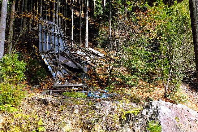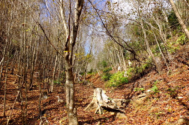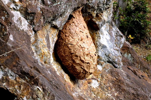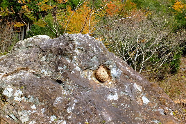 月輪寺登山口から梨の木谷を登って行く。この辺りは植林ばかりで紅葉している木は少ない。梨ノ木大神着10時8分。2年前までは倒木に覆われていた谷も去年整備されスッキリしたんだが、通る人が少ないのでまた草が茂ってきている。このまま年が経つと以前みたいな荒れた谷に戻って行くのかも。ネットを見てもここを歩いている人は少ない。以前建っていた小屋は潰れたまま放置されている。大岩に巨大な蜂の巣があった。今年は台風もなく陽当たりが良いんだなあ。