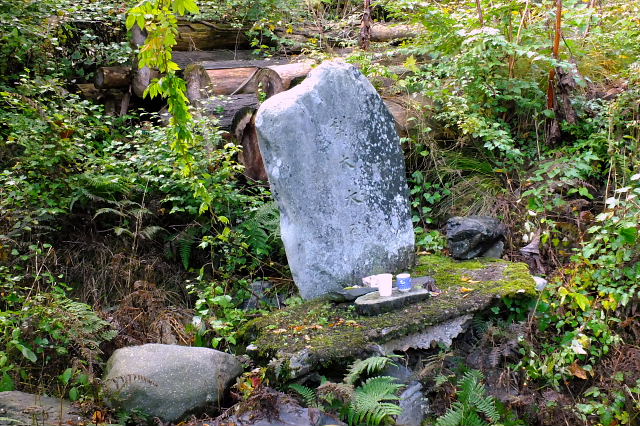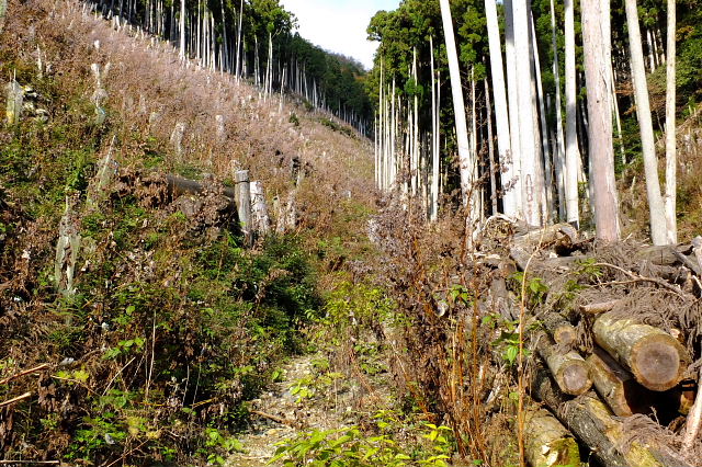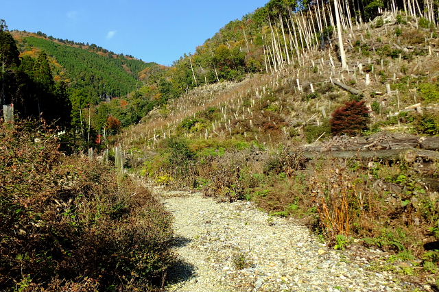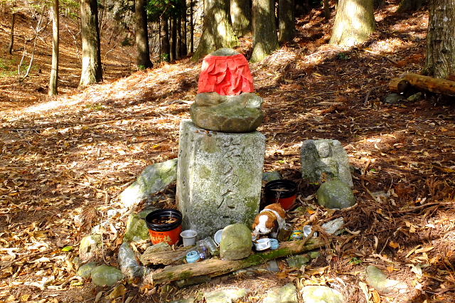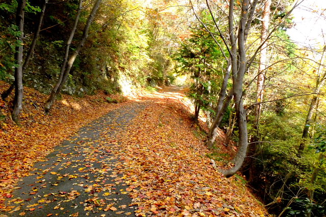 首無し地蔵着11時半。ここまで登ると紅葉は終わりかけで落ち葉が積もっている。軽く軽食タイム。ハイカーが一人愛宕山から降りてきた。ここから愛宕に登り下りするハイカーは表登山道に較べると極端に少ない。高雄までは長い林道下りで面白味に欠ける。道脇の木は紅葉終盤で色褪せているのが多かった。林道から登山道に入る手前の広場で一服していたらマウンテンバイク二人組が降りてきた。ハイカーは峠で一人会っただけ、他はこの2名。人気がない道なんだ。春は桜が咲いて明るい所だが秋は枯れた色の物寂しい世界。