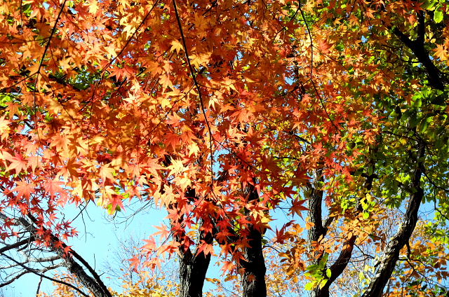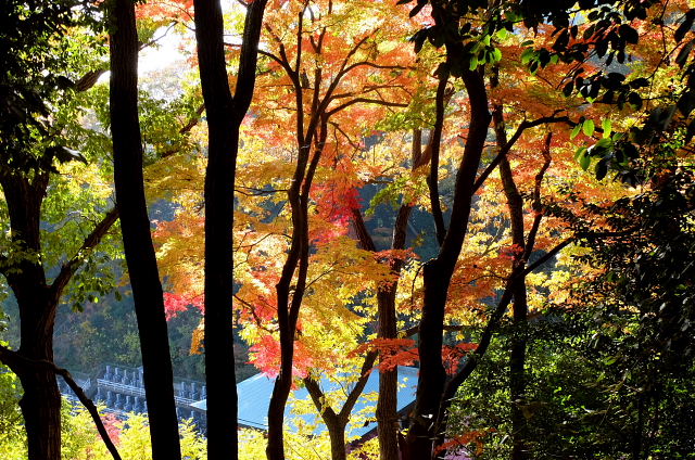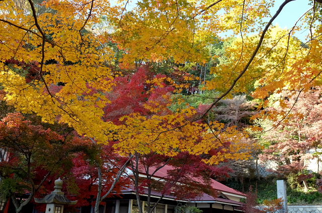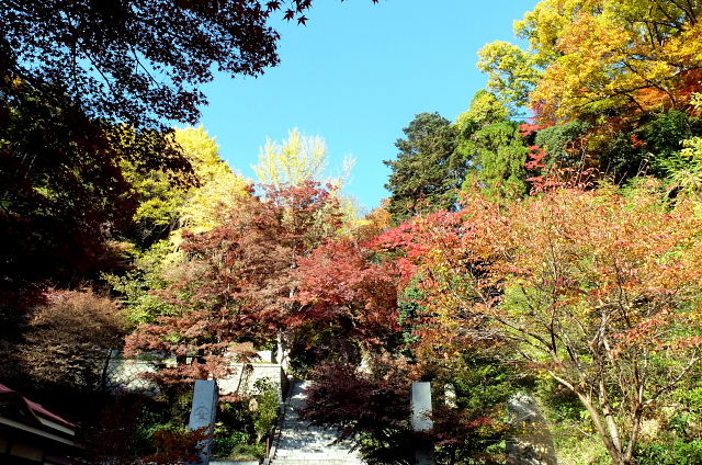 雷声寺までの道も適度に紅葉していたがハッとするような景色じゃない。マア色は付いてるなあ、くらいかな。落葉も多いしこれから色が鮮やかになることはないだろう。やっぱし秋までの高温が影響しているのかも。ネットでは観光に影響が出るようなこと(2025の紅葉はイマイチ)が書けないから、如何に今年は素晴らしいなんてのが多くなる。マア人それぞれの感じだから否定は出来ないけど、自分の感じではそれほどでもない。降り着いた雷声寺もそんな感じ。陽当たりが悪いから映りが悪いのかとも思ったが……赤より黄色の方がくすんでいるように見えた。何回も来ているから最高だった年との比較になっているのかもしれない。