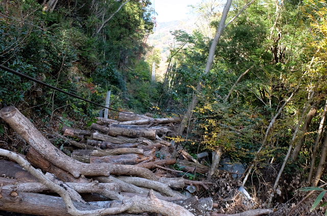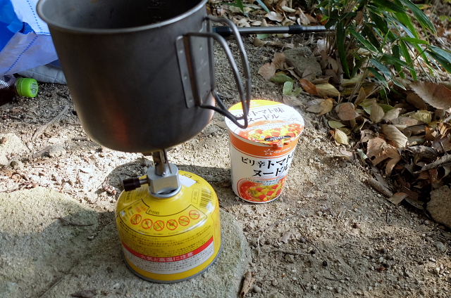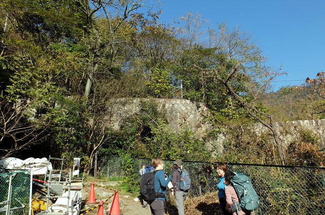 行者小屋手前の沢で水を汲む。旧摩耶道分岐辺りも紅葉が綺麗なところなんだが今日はマアマアてとこかな。陽の当たりが悪いと紅葉が冴えないから。旧摩耶道は山腹を巻く道がクネクネ付いている。一応周囲の木々は色付いてるけど鮮やかじゃない。旧砲台跡から南に延びる尾根でランチタイム。バーナーでお湯を湧かすのも久しぶり、この前は何時だったかな。最近はエスニック風ピリ辛トマトラーメンが定番になっている。砲台を見物しているハイカーが一人いた。ここから下は学校林道にハズなんだが“危険廃道”の札があった。