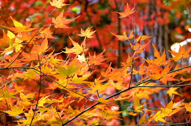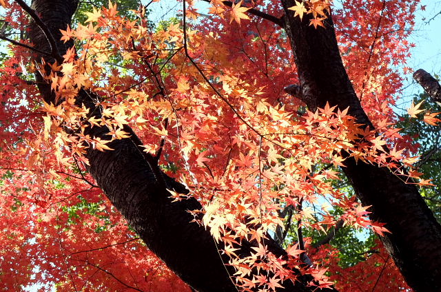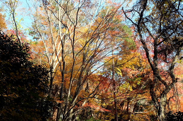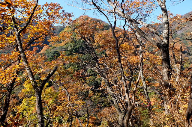 杣谷登山道に入ってすぐの堰堤から摩耶観尾根に上がる。ナンの工事か知らんけど去年と変わらず“工事中立入禁止”の札が立っている。その箇所は摩耶山頂から架線がかっていたが工事をしている風じゃない。この尾根は始めが一番キツい。鉄塔が立つ辺りまで登ると後は傾斜も緩くなってくる。紅葉は……時折真っ赤な木もあるけど全体で見ると、まだみたいに見える。旧摩耶間ホテル手前の小広い辺りの紅葉が一番綺麗だった。上下に“立入禁止”の札があるのでこのルートを歩く人は少ないだろう。今年もこの紅葉を見てるんだ、後何年……なんて先のことを考えてもどうにもならん。去年もここで一服した時そんなことを思っていたが1年経つとこんなにも状況変化があるんだ。自分だけじゃなく周りも変わっていくからなあ。春と違い秋は物思いが沈みがち。