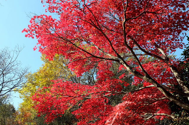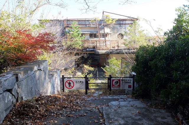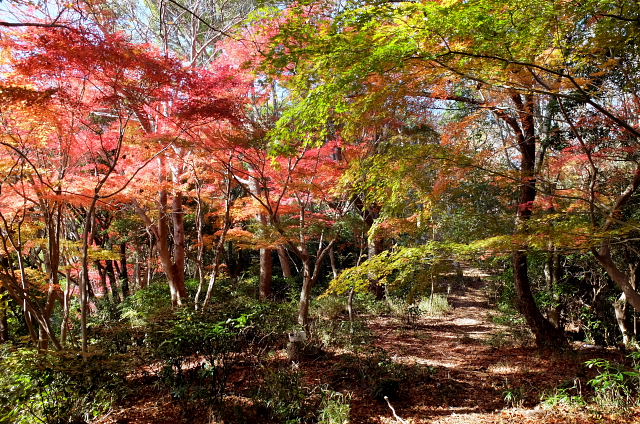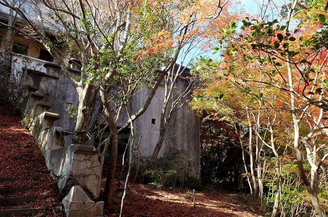 秋の摩耶観ホテルは当に廃墟のイメージ。上の方から子供達の声が聞こえている。ケーブル駅からここに下る道は何重にも柵が設置され入れないようになっている。柵を乗り越え虹の駅まで来た。駅前のカエデは真っ赤になっている。近畿の山は植林が主体だから全山紅葉になるところは少ない。上野道を史跡公園まで上がり休憩するのがパターンだったが、今日は省略して青谷道を下る。行っても少し見晴があるだけだし体力も落ちてるんだ。