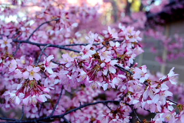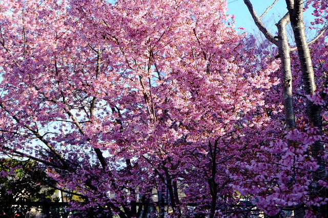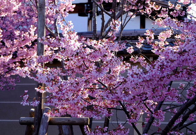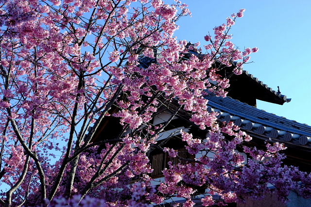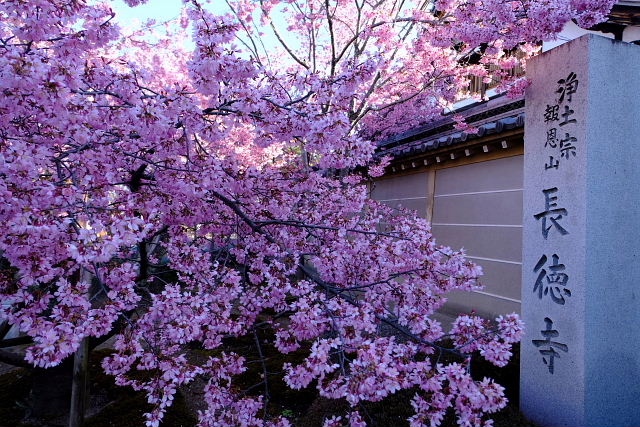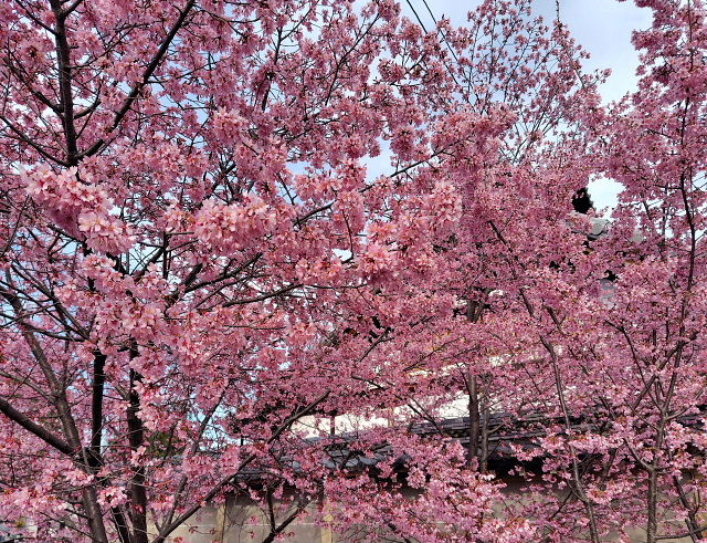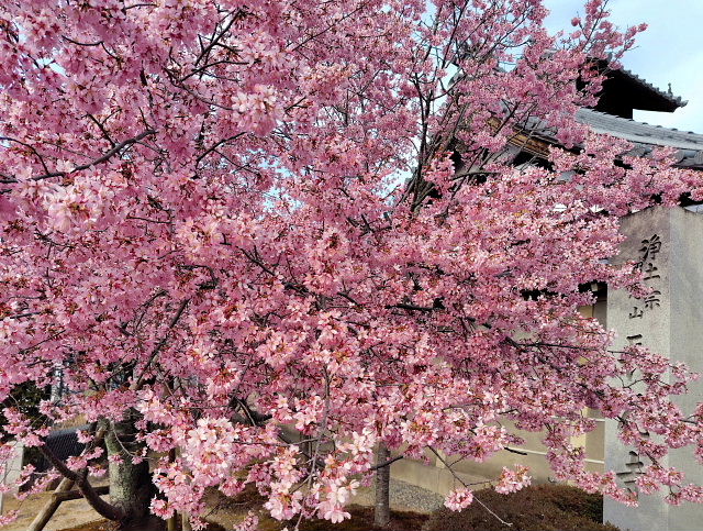 さあ今年の“おかめ桜”は。出町柳着7時58分、地上に上がり長徳寺を見ると薄ピンク色になっている。斜め上の陽差しで被写体としてはイマイチだが満開!!。去年は月22日に来た時が満開だったから今年は10日以上早い。寒いから遅いかと思っていたけど花の咲き具合は気温じゃないんだ。朝早いのでギャラリーは僅か。今日は昼からの方が晴れるとのことだから、帰りにもう一度来て写した方がイイか。