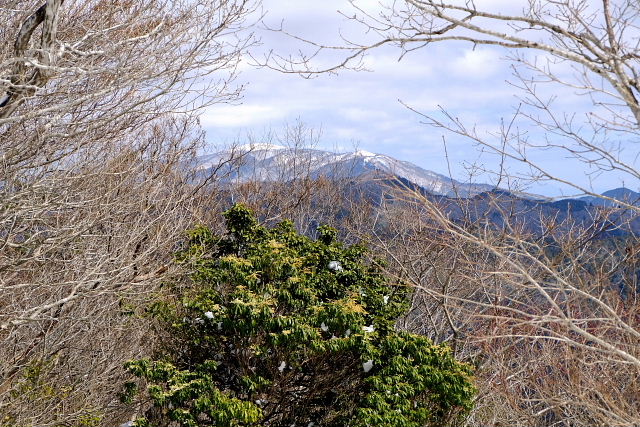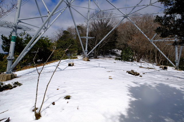 雪の斜面を登り切り天ヶ岳の稜線に着くと一面の銀世界。今年も雪の上を歩くことが出来た。ゆるやかな巻き道を上り百井峠からの道に合流して尾根に上がる。下は雪道でも陽当たりが良い鉄塔広場だと地肌が見えているハズなんだが、今日は一面雪に覆われている。そんなに雪が多かったのかなあ。遙か彼方に残雪の比良山が見えている。
