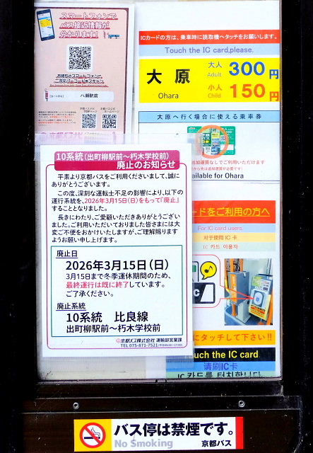 弁当屋さんでオニギリ弁当を買い叡山電車に乗り込む。八瀬比叡山口着8時33分。駅前のロウバイが枯れた花を付けていた。次の大原行バスは8時46分小出石行。バス停に“3月15日をもって比良線(出町柳~朽木学校前)廃止”の貼り紙があった。今は冬季運休中だから実質もう廃止になっている。昔は毎日走っていたが、10年ほど前からは土日だけになった路線。これに乗ったのは何回あるんだろう。安曇川沿いの山(皆子山など)に行く時は乗っていた。運転手不足とのことだが何時かは消えていく運命にあったのは確か。辺鄙な山に行くには車がなければ無理なんて嫌な時代になってるんだ。昔は良かった……言いたくない言葉を言うことが多くなっている。