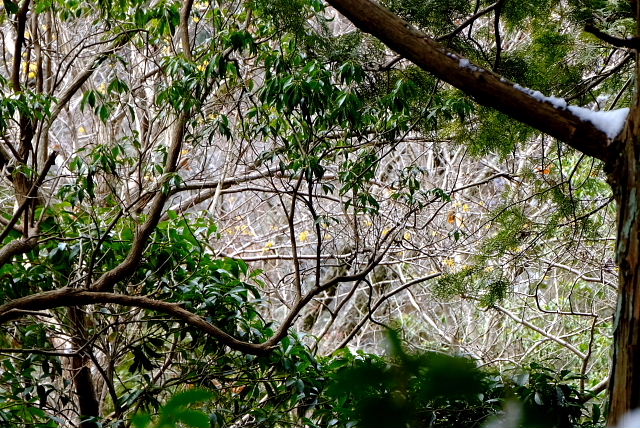 バスの乗客は半分ほど。大原着9時過ぎ。雲が多く気温は低い。周りの山を見上げると微かに白い所も見えている。雪が残ってるような。寂光院を過ぎ山に入っていくと木に積もった雪片がポトポト落ちてきた。登りにつれ道も白い所が出てきた。焼杉山からの稜線に出ると冬景色。3月中半なのにさすが京都北山だ。山腹を巻く道に入ると段々雪が増えてきた。前来た時はこんなに雪が多かったんかなあ。人が歩いた形跡はなく小さな獣の足跡が付いているだけ。シャクナゲ尾根分岐辺りの南側斜面にマンサクの花が見えたが崖っぷちで近寄れない。今日のカメラはX-T20だから望遠はダメ。写してはみたが、何を撮ったのかサッパリ分からん。