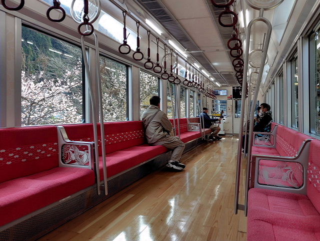 いままでは喫茶KANOでお茶してから長徳寺(出町柳)のおかめ桜見物のコースだったんだが、最近はこのカフェの人気が高まり開店同時で窓側席が埋まる(または予約されている)ようになってきているので今年はカフェをスキップした。山に入る時は忙しないから桜の時にでもしよう。出だしのカフェを省くと時間調整が楽になる。でもあんまり早いと陽の当たりが悪いし、遅いと山から下りる時間が心配だし……両方を秤に掛けると出町柳8時頃が一番イイかな。淀屋橋発7時の特急をネット予約。これだと出町に着くのが8時前。桜見物して8時18分発八瀬行の電車に間に合う。弁当を買う時間もあるし。ネットではほぼ満席になっていたのに特急に乗ってみるとガラガラ。キャンセルも多いんだろう。