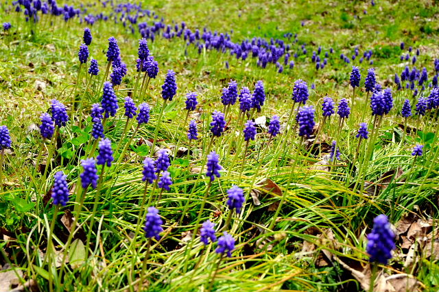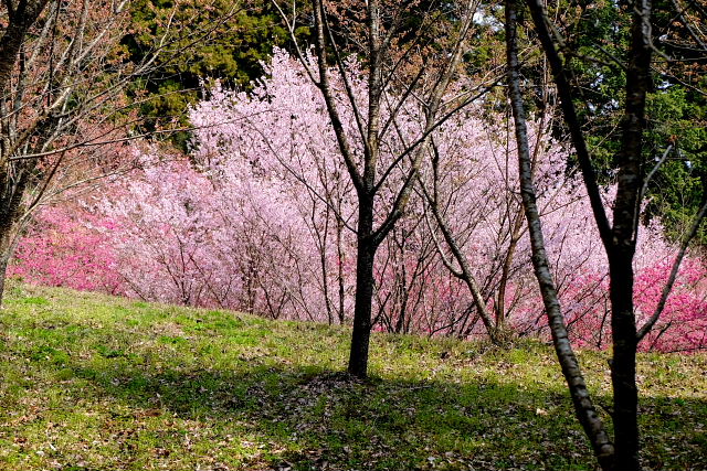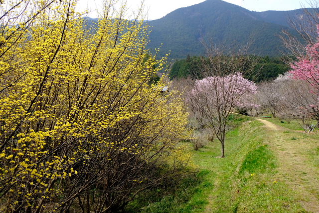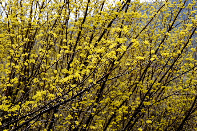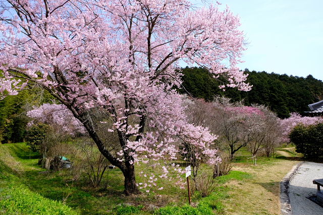 高天彦神社駐車場周りの桜もまd満開じゃない。葛城古道に入っていくと桜が咲き乱れ……なんて景色はなかった。空も白っぽい晴で花見には少しインパクトがない。橋本院の駐車場で体を拭き着替えた。花の寺橋本院だが庭園のエドヒガンだけが満開で後はまだ早い。ムスカリが群生する所で一服。桜より黄色い山茱萸が目立っていた。これだけでも極楽浄土の庭の趣はある。