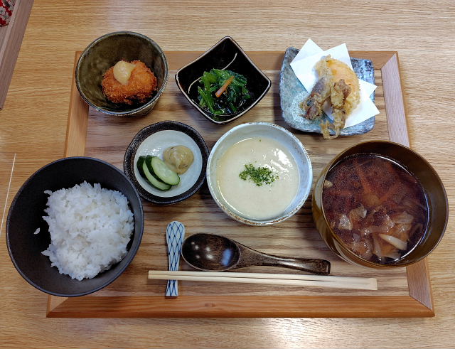 小殿からバスに乗り御所済生会病院前下車。昼は ごせ町料理koe でごせ町定食を食べた。桜時期の日曜だからいっぱいかと思っていたが1卓空いていた。毎月内容が変わってるのかな、前はだし巻きだったがトロロに変わっていた。横を流れる柳田川両岸も桜の名所。空が白っぽくなってきたけど今日見た桜では一番咲いていた。マニカレーに寄り何時ものカレーを土産に買う。最近はマニさんを見ない。