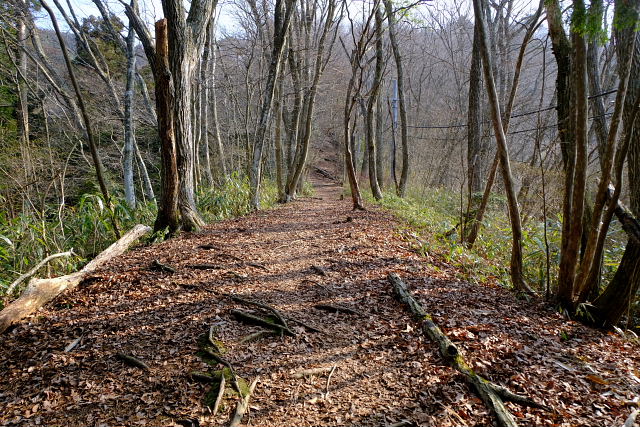 細尾谷出合から谷に入りカタクリ尾根登り口でモーニングタイム。チャイとジャムサンド、不味いフィッシュソーセージ。男性単独行と三人組女性(大きなカメラ持ち)が登って行った。このルートは稜線まで一気登りなので早く着く。名前のカタクリは何処に咲いてるんだろうか。まだ咲く時期じゃないけど。ネットで見るとこの尾根じゃなく上の遊歩道から稜線の間に“かたくりの道”とやらがあるとのこと。最高峰に突き上げる道にも咲いてるとか書いてあったけど今日は見つけられなかった。良く探せばあったのかも知らんけど、また次の機会にしよう。